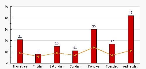 | Wednesday | 42 | 29.17% | +25  | 11 | 17.46% | +4  | 11 | 17.46% | +4  |