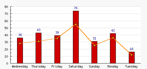 Saturday | 74 | 26.33% | +35  | 55 | 24.77% | +20  | 55 | 24.77% | +20  |