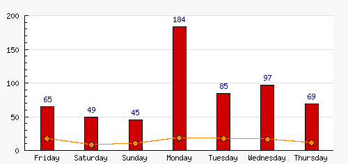 | Monday | 184 | 30.98% | +139  | 19 | 19.00% | +9  | 19 | 19.00% | +9  |