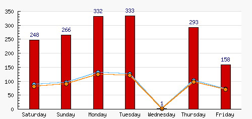 | Saturday | 248 | 15.21% | +248  | 88 | 14.24% | +88  | 82 | 13.99% | +82  |